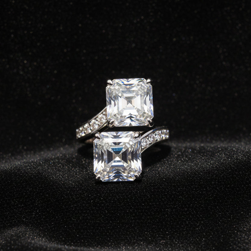 10.93 CTW D-Color VVS Moissanite Stones: Showcasing a hand-set Asscher-cut moissanite center stone, surrounded by smaller hand-set round-cut moissanite diamonds for maximum fire and brilliance.