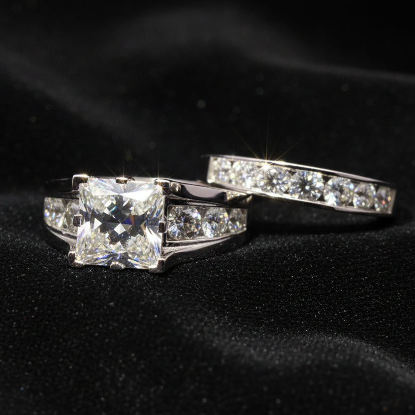 2.05 CTW D-Color VVS Moissanite Stones: Includes a hand-set princess cut center stone and complementary round-cut moissanite diamonds across both the ring and band.
