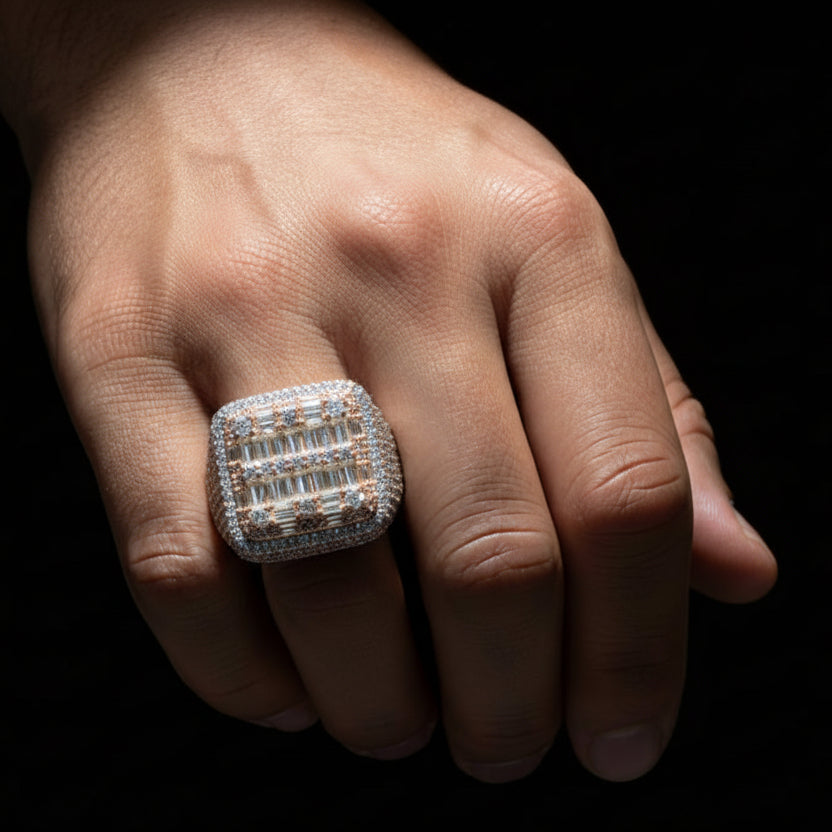 Baguette-Cut and Square Design: This innovative combination of baguette-cut and square moissanite stones creates a striking, geometric effect that maximizes light reflection and enhances the brilliance of the ring.